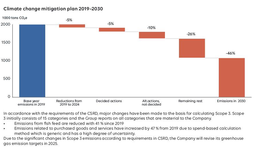 2024 was the first year Lerøy reported according to Corporate Sustainability Reporting Directive (CSRD). The Group's Scope 3 accounting was updated considerably ensuring compliance with the requirements in CSRD as well as completeness fo all reporting categories. This is a major change which contributes to much higher GHG-emissions compared to the original 2019-levels. This is a complex area and, in coming years, the Group will continue to work on improving data quality, particularly within the category Purchased Goods and Services.