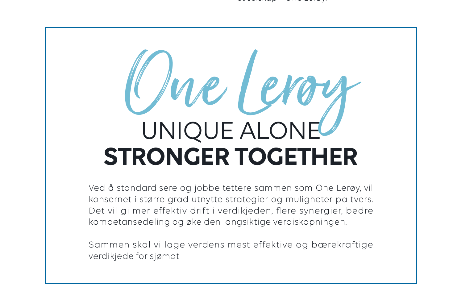 Vi er allerede godt i gang med 2021. Takket være våre ansatte, våre leverandører og ikke minst våre kunder, og med en verdikjede for fremtiden, har vi i Lerøy sterk fremtidstro. Som det heter i vårt slagord: One Lerøy. Unique alone - Stronger together.