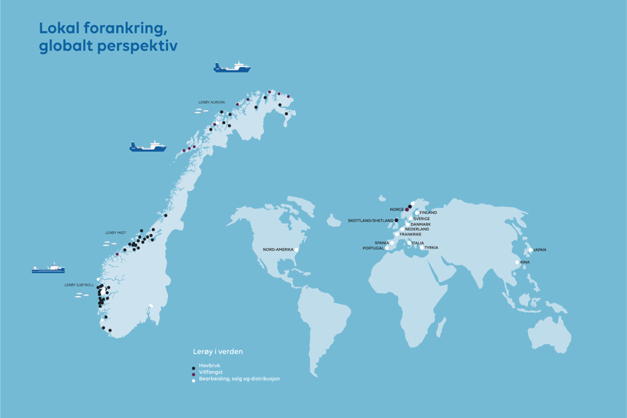 Hovedkontoret ligger i Bergen, men vi driver med fangst og havbruk langs hele kysten av Norge. Lerøy eier 10 trålere og får jevnlig leveranse fra mer enn 600 kystfartøy. Daglig leverer disse hvitfisk til mottak for prosessering og pakking, mens brønnbåter sørger for å frakte laks og ørret fra våre anlegg i Nord-Norge, Midt-Norge og på Vestlandet til pakkeri for videre bearbeiding.
