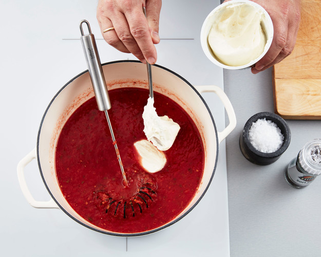 2. Tilsett rømme, og kok opp suppen under omrøring i cirka 5 minutter.