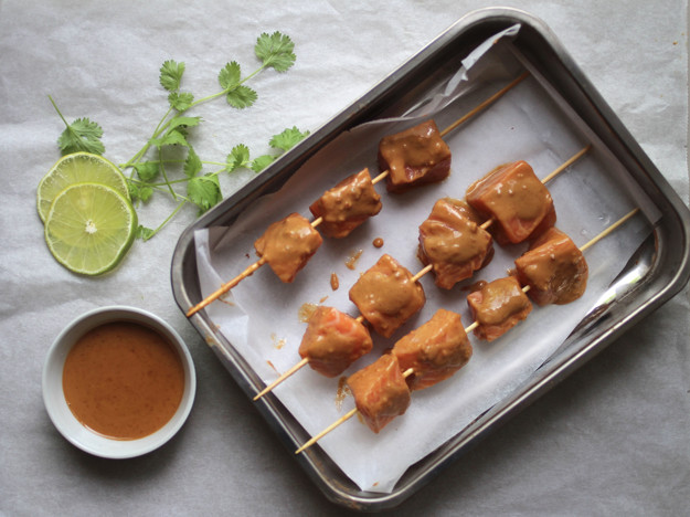 1. Grillspyd med laks og sataysaus kan enten serveres alene som en etter trening-snack, eller sammen med fullkornsris eller nudler som en fullverdig middag. Du kan selvsagt også legge til grønnsaker, for eksempel edamamebønner, bakt paprika, grillet mais eller en grønn salat.