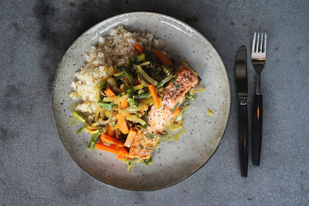 2. Innholdet i denne fiskesuppen laget på kokosmelk kan du sette sammen som du vil. Du kan bruke en blanding av laks og torsk (genialt for å bruke opp rester som ikke rekker til en hel middag!), bare torsk, bare laks, eller hva med å blande inn noen reker? I denne retten kan du bruke fryst fisk eller halvtinte fileter, men juster i så fall opp koketiden med 4-5 minutter slik at fisken får trekke lenge nok til å bli varm.