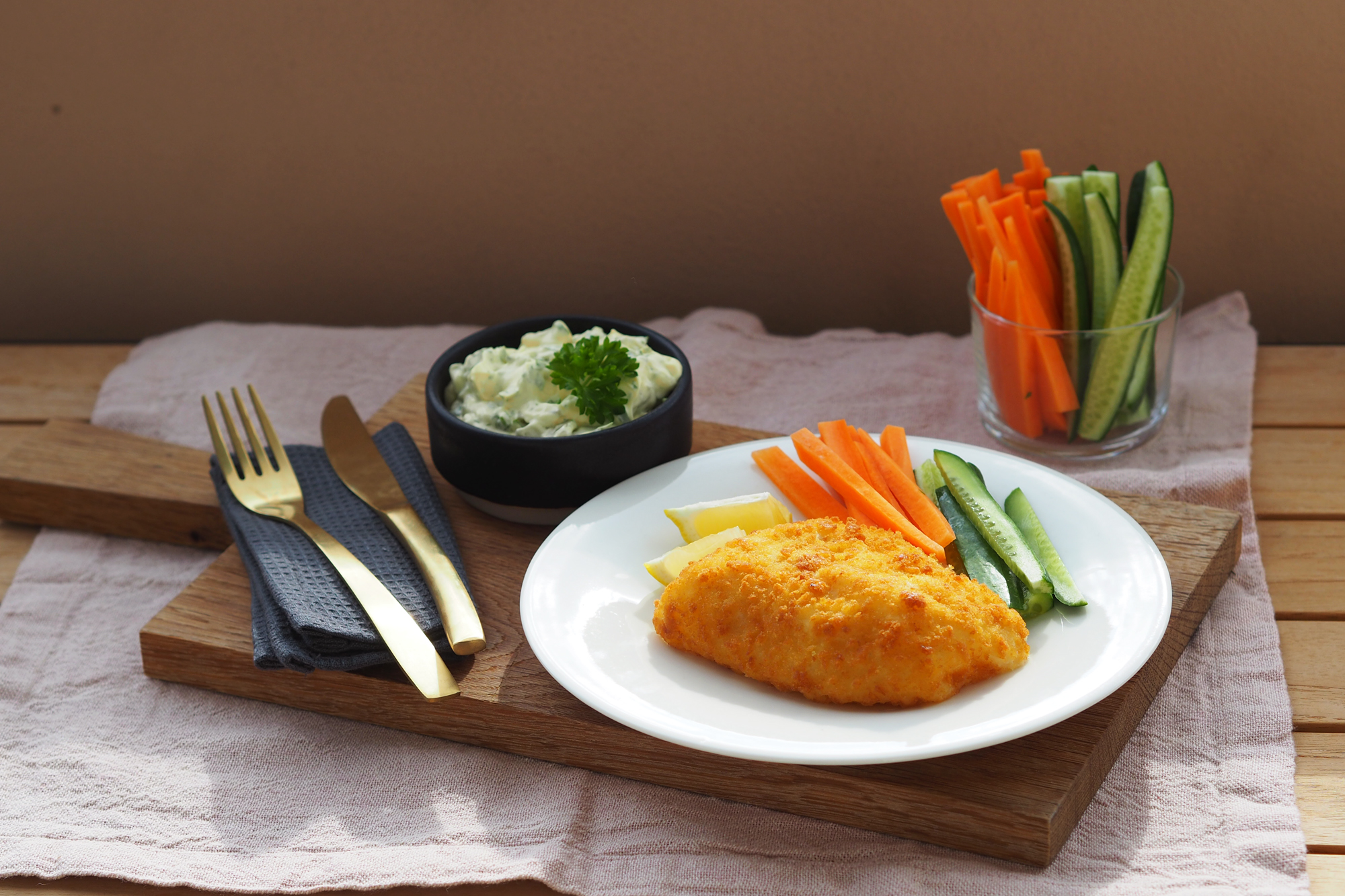 2. Dette middagstipset med panert torsk kan de fleste lykkes med. Mens fisken står i ovnen kutter du opp grønnsaker. Server med hjemmelaget eller kjøpt remulade.
