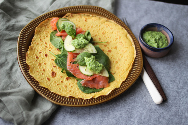 – Denne retten med kikertpannekaker kan være et utgangspunkt for så mye forskjellig, og kan spises til frokost, lunsj, middag eller som del av et tapasbord. Ønsker du å variere den kan du droppe agurken, smøre på litt kremost sammen med den grønne sausen, rulle den sammen og varme pannekaken litt i stekepannen med laksen inni – nam!