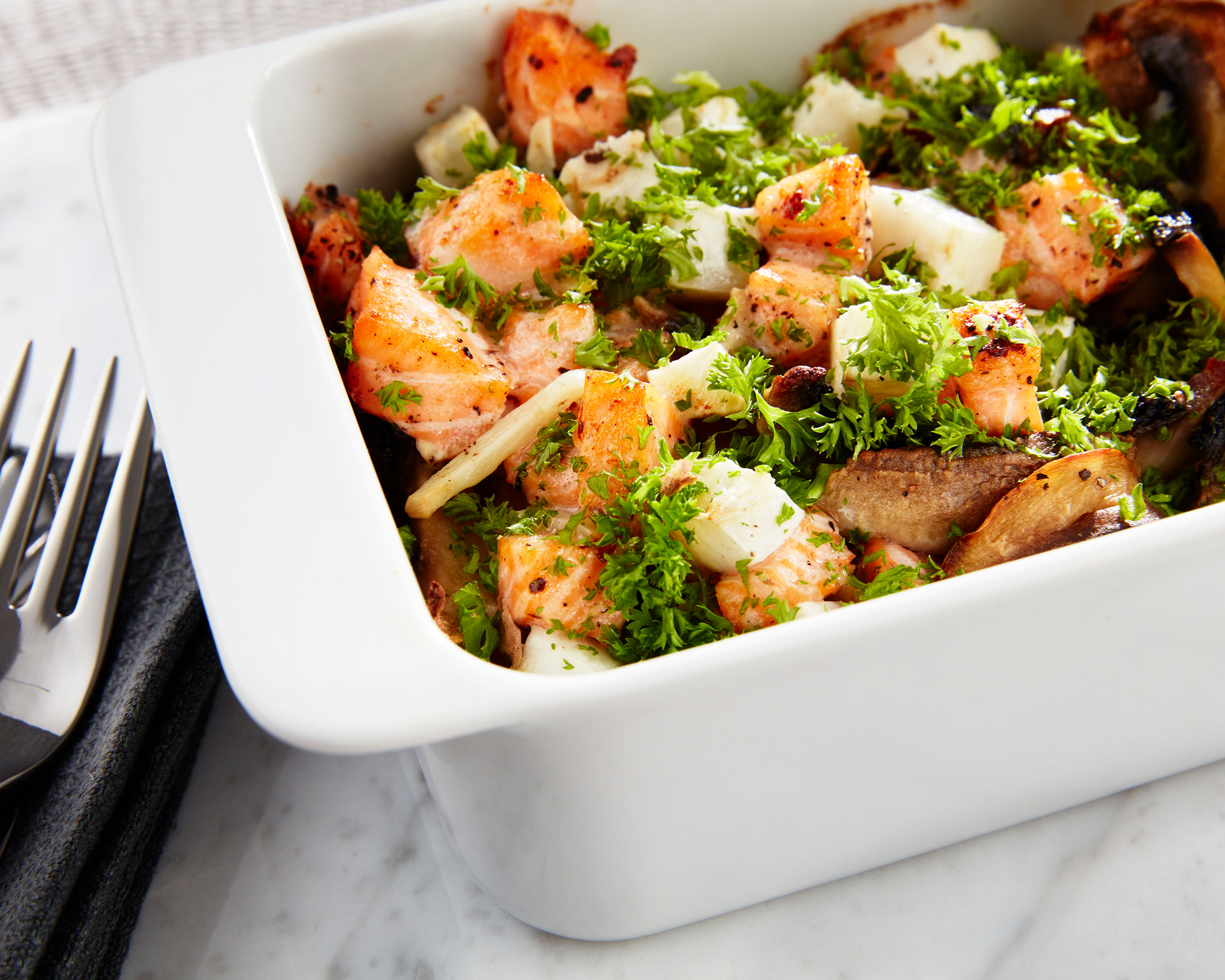 Laks i form med sjampinjong, sellerirot og hvitløk