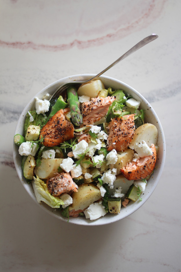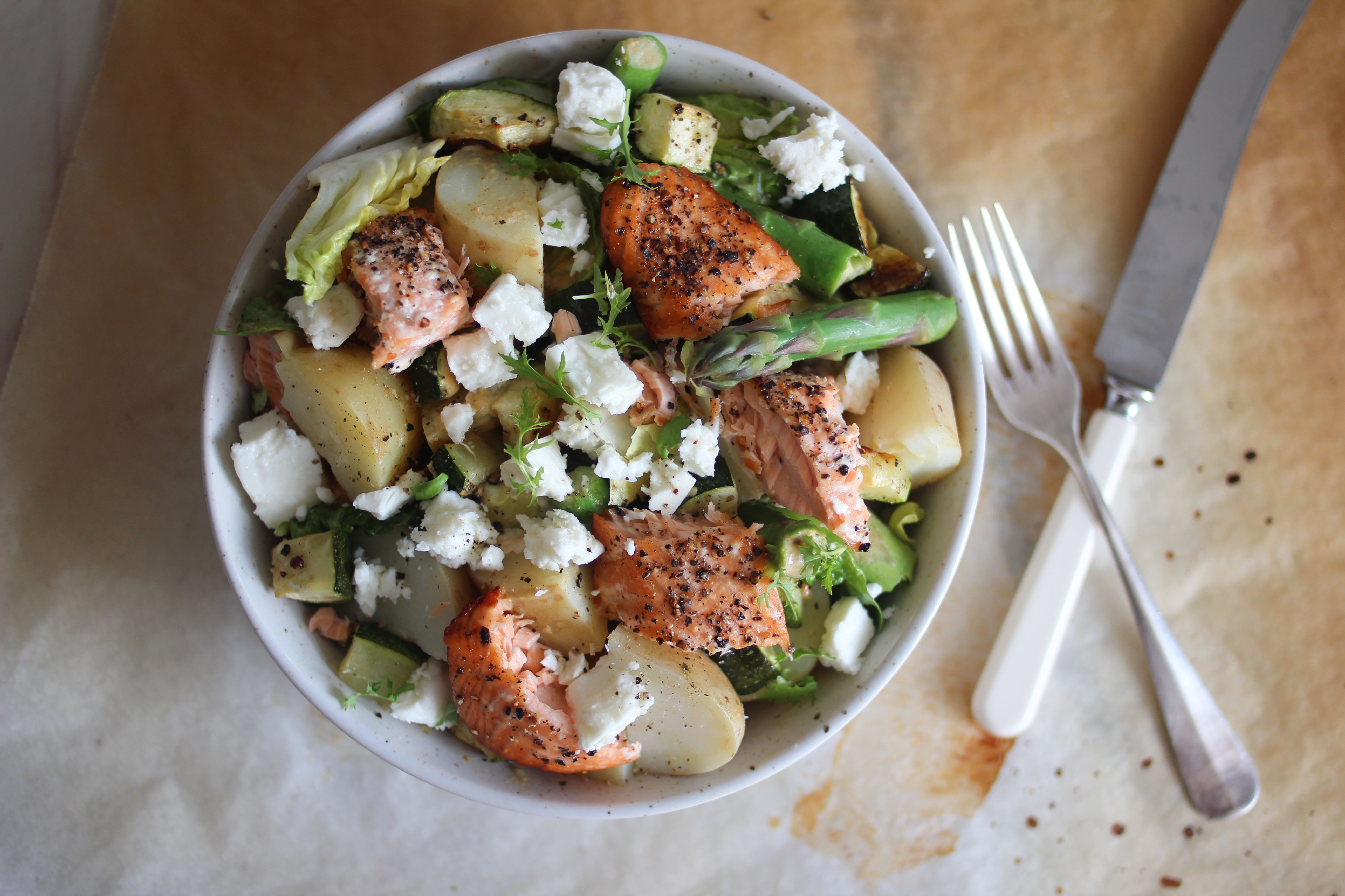 2. Man føler virkelig at man lever godt når sunn mat kan smake så godt som denne retten med laks og lun potetsalat. Legg potetene til koking, og laks og grønnsaker til steking i ovnen mens du skifter ut av treningstøyet – når du tar disse ut av ovnen gjenstår bare detaljer.