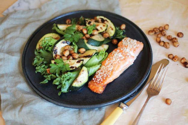 Ovnsbakt laks med grønnsaker og spicy kikerter