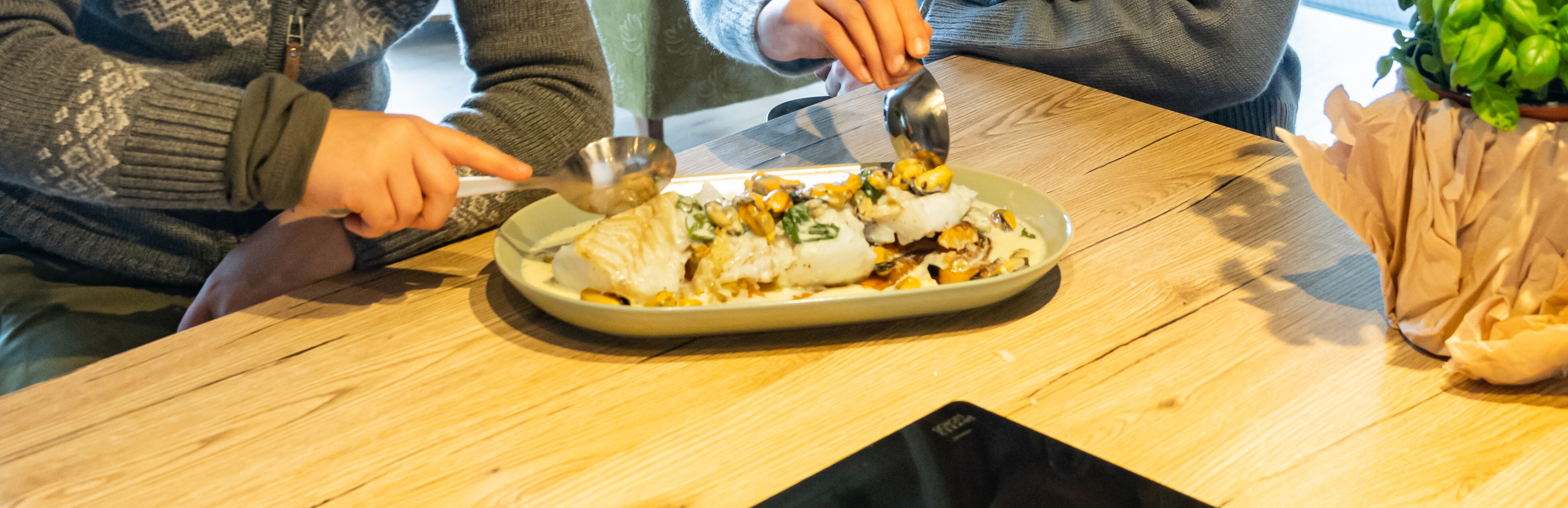 Fremgangsmåte på stekt torsk med kremet blåskjellsaus: