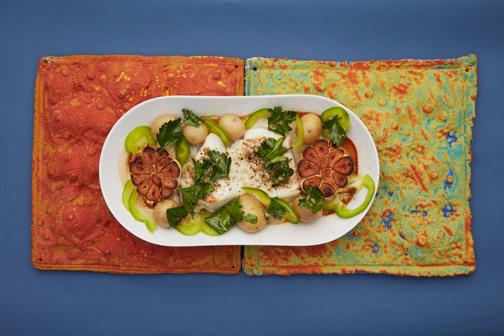 6. Server trukket torsk med mandelpotet, dampede grønnsaker og dillsmør.