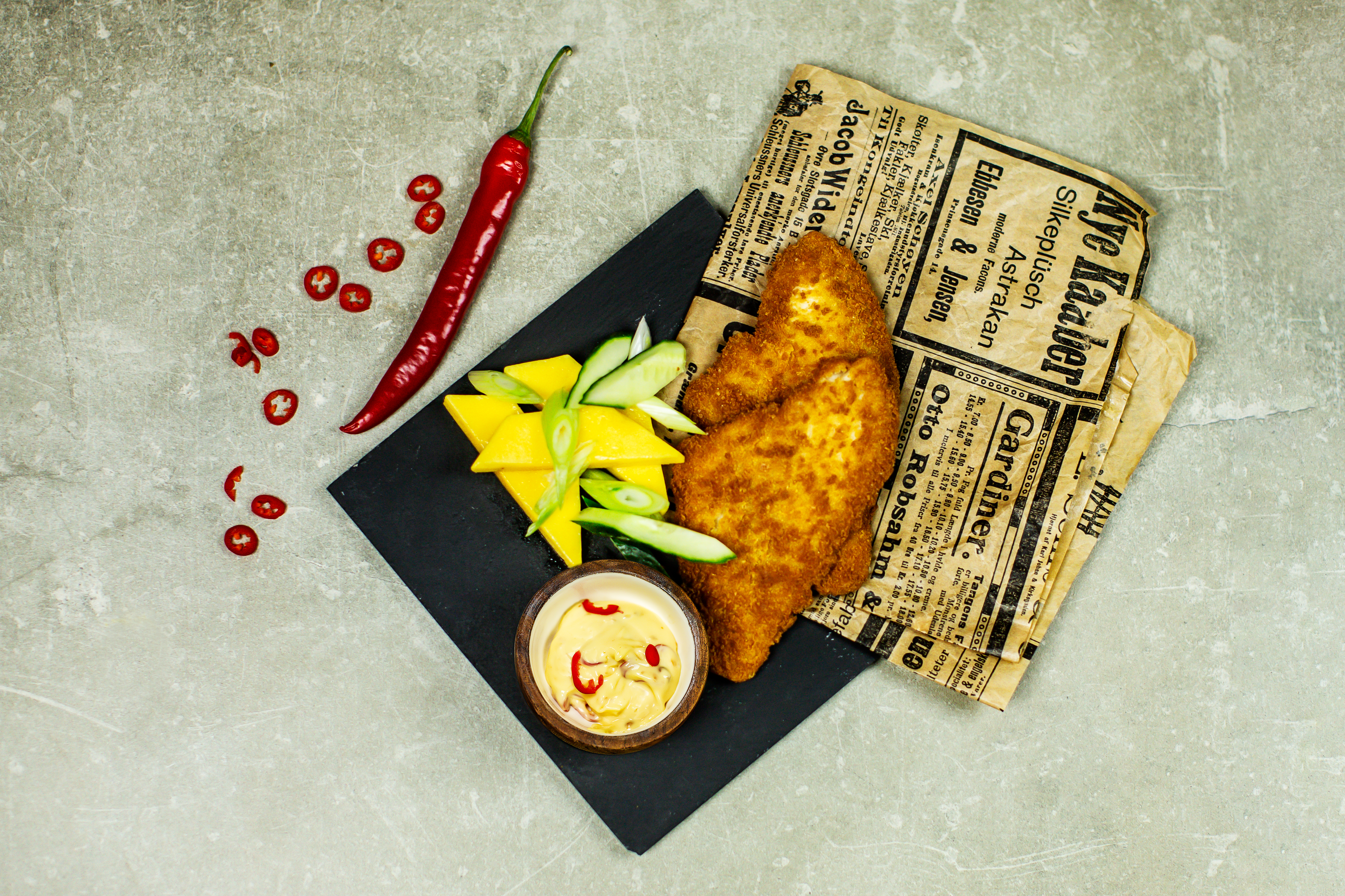 Panert rødspette i briochebrød med soyamajo, epler, ruccula og rødløk