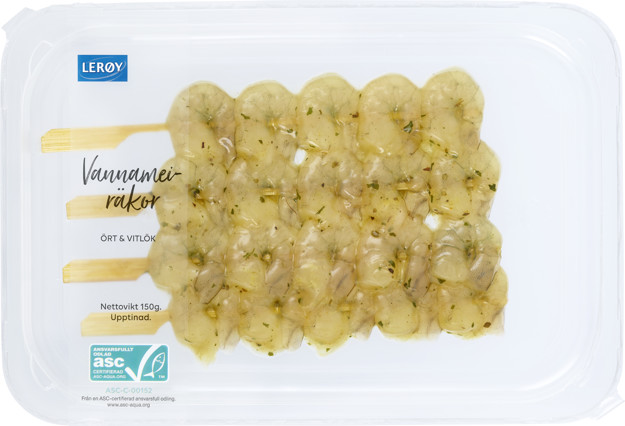 Produkt: Vannameiräkor ört & vitlök på spett 150g, ASC